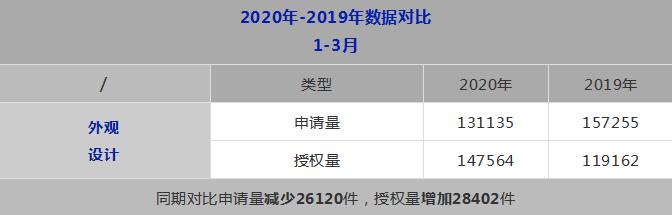 1-3 月,我國外觀設(shè)計專利申請 13.1 萬件,外觀設(shè)計專利授權(quán) 14.8 萬件。截至 2020 年 3 月底,外觀設(shè)計專利有效 量為 186.9 萬件。
