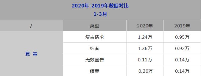 1-3 月,我局受理復(fù)審請求 1.24 萬件,結(jié)案 1.36 萬件。受理無效宣告請求 0.11 萬件,結(jié)案 0.20 萬件。