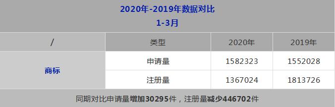 2020 年 1-3 月,我國商標申請量為 158.2 萬件,商標注冊量為 136.7 萬件。截至 2020 年 3 月底,有效注冊商標量 2638.2 萬件。