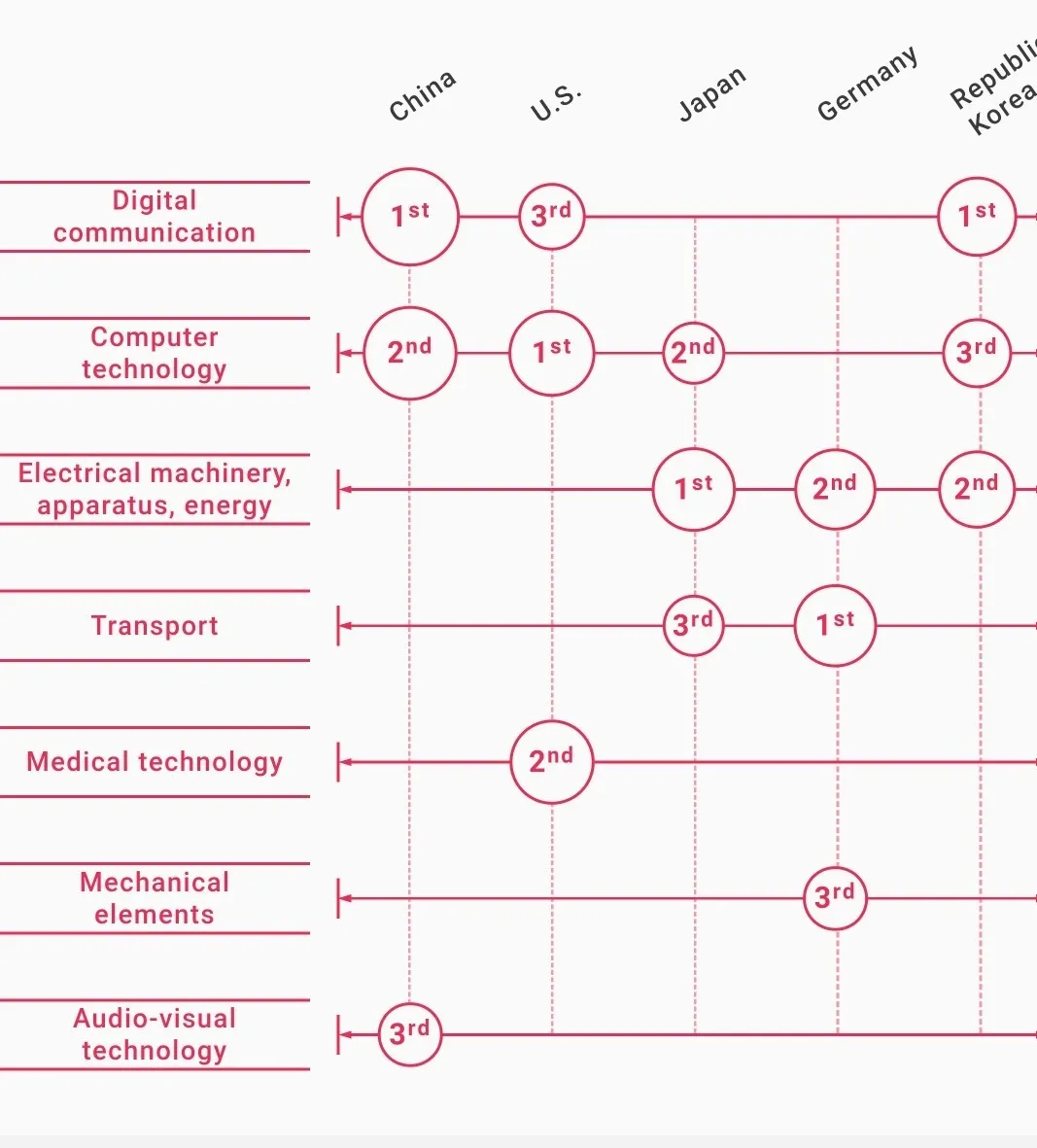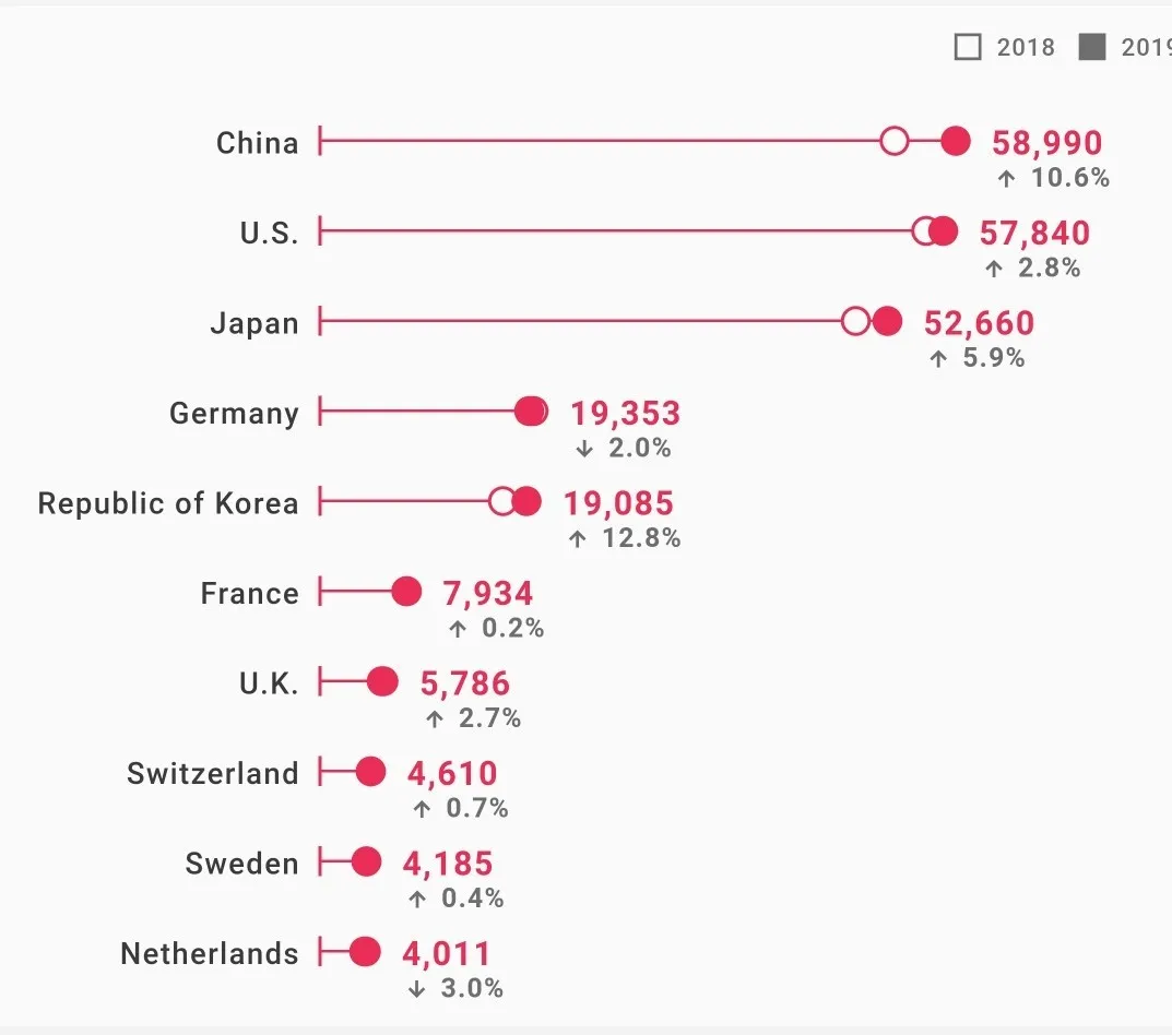 2019年,通過PCT提交的國(guó)際專利申請(qǐng)量為265,800件,增長(zhǎng)率為5.2%。這是美國(guó)第一次讓出頭名的座次。自1978年《專利合作條約》運(yùn)行以來,美國(guó)一直蟬聯(lián)榜首。另三個(gè)排名前五的國(guó)家日本、德國(guó)和韓國(guó)則維持了上一年的排名不變。