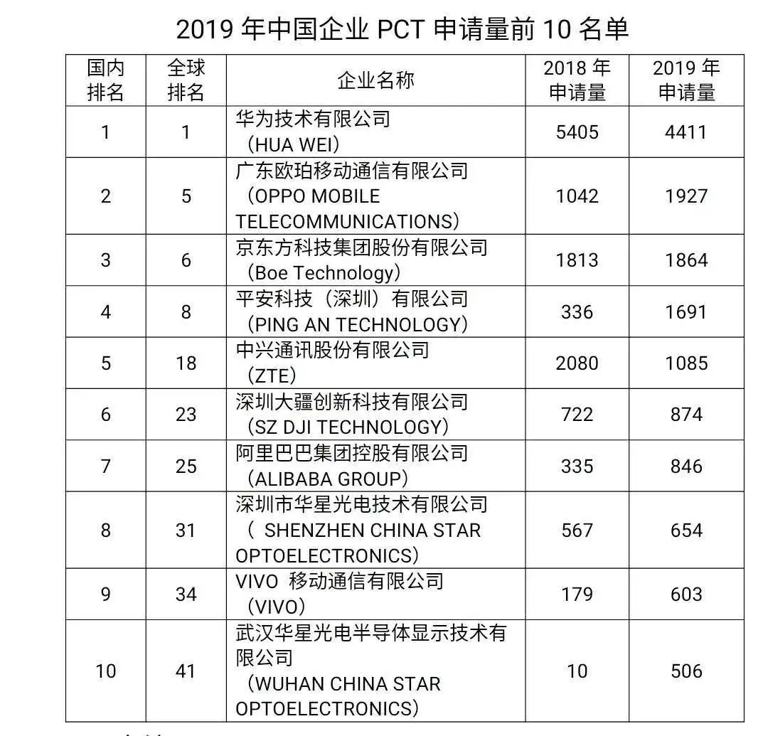 2019年P(guān)CT國(guó)際專利申請(qǐng)前十的申請(qǐng)人中,中國(guó)的華為技術(shù)有限公司以4411件PCT國(guó)際專利申請(qǐng)排名第一。位居其后的是日本三菱電機(jī)株式會(huì)社(2661件)、韓國(guó)三星電子(2334件)、美國(guó)高通公司(2127件)和中國(guó)廣東歐珀移動(dòng)通信有限公司(1927件)。